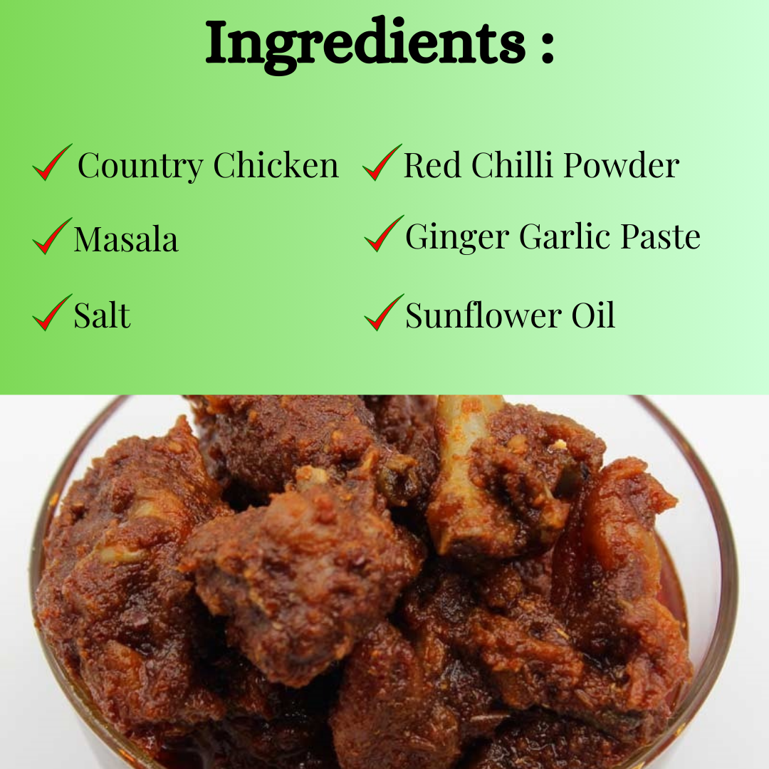 Traditional & Nutritious: Country chicken is known for its rich protein content and unique taste, making this pickle both delicious and wholesome.